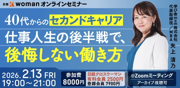 日経クロスウーマンでは、学び舎mom株式会社代表取締役の矢上清乃さんをお招きして「40代からのセカンドキャリア 仕事人生の後半戦で、後悔しない働き方」をテーマにオンラインセミナーを開催します。自分らしいキャリアを再設計する方法をたっぷり2時間お伝えします。